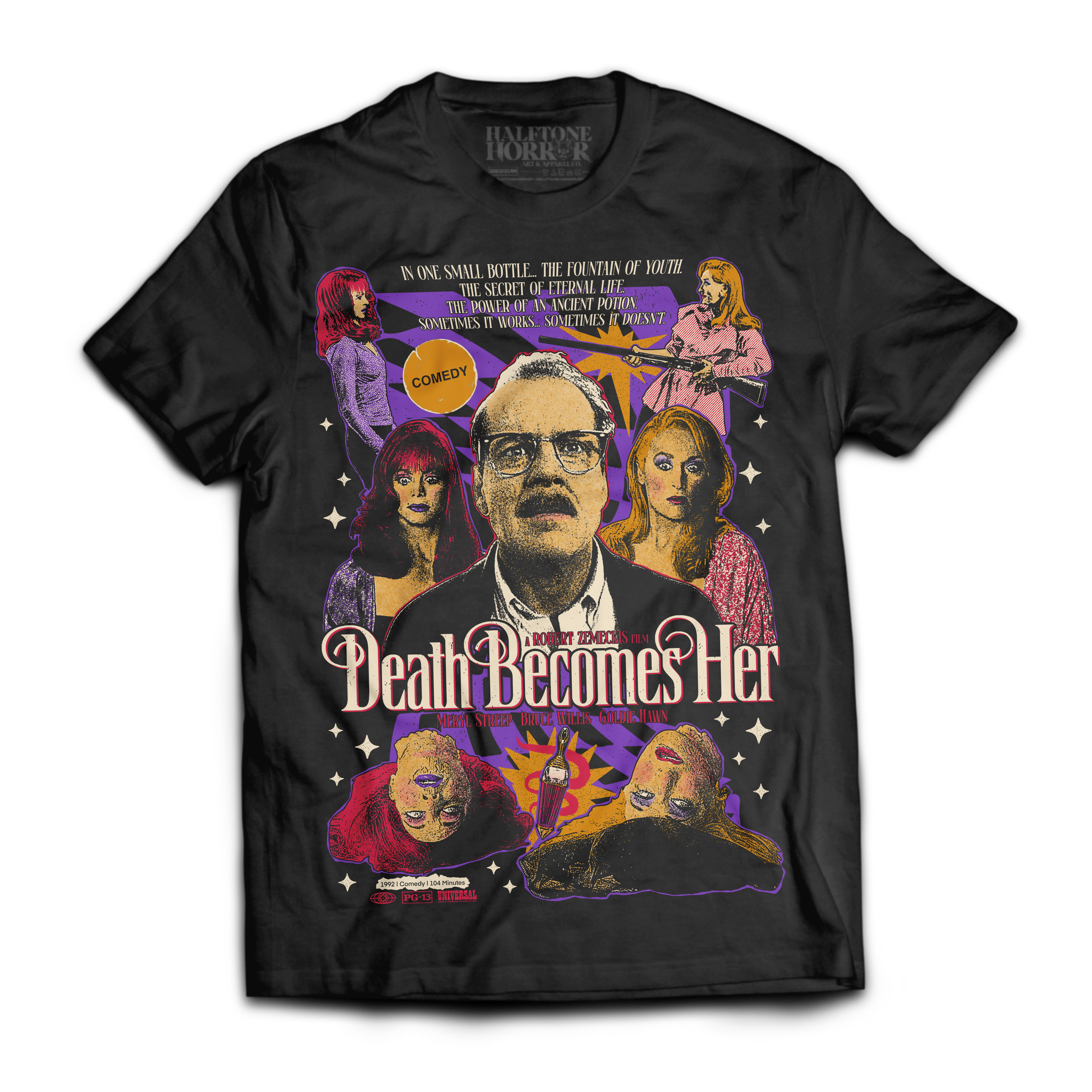 Featuring artwork by Cameron Buell (Halftone Horror). Shirts are screen printed on Gildan Soft Style Cotton for a true-to-size fit.